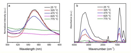 According to the FTIR spectra, the absorbance for IR waves in the range of 3750 to 2500 cm−1 and 1000 to 400 cm−1 drops drastically with an increase of sintering temperature. This can be explained by the reduction of number of bonds absorbing in those ranges. This fact is caused by extreme heating of the nanoparticles resulting in deoxidization of germanium oxide in inert atmosphere to pure semiconductor. As a result, it can be observed that the intensities of the GeO peaks decrease with an increased temperature from 25 to 475 °C, and the peaks disappear for germanium nanoparticles, produced at the temperatures 625 and 775 °C.
