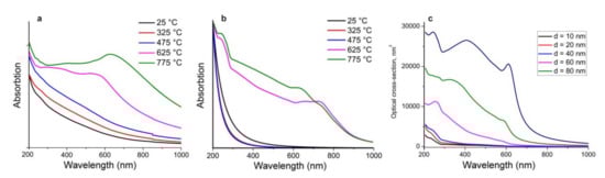 To provide deep insight into the nature of the shape transformation of the absorbance curves for germanium nanoparticles, synthesized at different temperatures, rigorous Mie theory simulations were accomplished [30]. According to electron microscopy analysis (Figure 1) none of the obtained samples is monodisperse; all five samples contain particles in a rather wide rage. In particular, germanium particles with sizes from 2 to 37 nm exist in the sample prepared at 25 °C, while particles with 6 to 60 nm diameters occur in the material produced at 475 °C, whereas particles with diameters from 14 to 170 nm were found in the sample sintered at 775 °C. We suggest that the discrepancy in optical absorbance appears to be due to a different size distribution of the germanium nanoparticles in different samples, as it has been shown for plasmon resonance peak shape transformation for polydisperse aluminum nanoparticles [31]. According to the Mie theory, the extinction cross-section could be presented as a sum of multipole harmonic series [32,33]. Taking into account data presented in the work [34] on Ge complex refractive index spectrum, we calculated the average extinction cross-section of nanoparticles in correspondence with the obtained distribution. For the particles with an amorphous matrix we take into consideration the presence of an amorphous shell with a refractive index of 1.7 for GeO2.