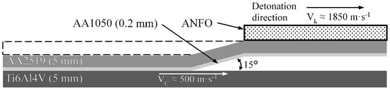 The main research object is an explosive welded material which consists of the three alloys: AA2519–AA1050–Ti6Al4V. According to the developed technology, the welding of these materials involved parallel plating of AA2519 aluminum and Ti6Al4V titanium layers, whereas the lightweight alloy was a layer to be applied. As a result of this, the titanium had no direct contact with the explosion. Prior to the welding process, the aluminum layer was rolled onto a 0.2 mm thick layer of AA1050 alloy. This procedure was in order to create a buffer layer between the materials. The process of welding was carried out in such a way that the speed of the flame front during detonation (Vk) ranged from 1850 m·s−1 to 2000 m·s−1, with the approach angle equal to 15°, whereas the impact zone shift speed (Vc) for the analyzed material was about 500 m·s−1. A schematic presentation of this process is given in Figure 1.