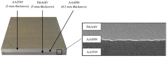 Chemical composition of materials (wt.%) that make up AA2519–AA1050–Ti6Al4V layered material [17,25,31].