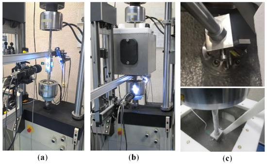 Experimental tests were conducted for both ambient and cryogenic conditions, which should be understood as the immersion of a specimen in a liquid nitrogen bath. To provide an identical temperature throughout the experiment, the tested specimen was placed in an environmental chamber whose lower pin was fixed directly on the strength testing machine. The chamber was made from two layers of Inconel with elements of thermal insulation placed between them, whereas the cover was made of Teflon to avoid freezing. The described element of the test stand is shown in Figure 3b,c.