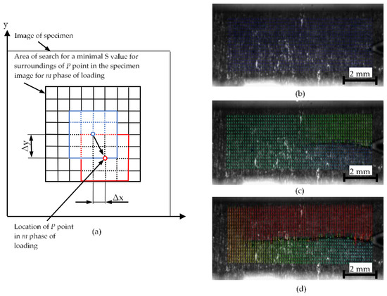 Next, the lowest value of the S sum is searched for by iterative methods. This is carried out by displacement of a selected area of the image recorded for the n stage of loading so that it can be found in the image in the m stage of loading. Eventually, an image in the form of relative displacements is obtained for particular areas of the recorded image. A scheme of the method operation and selected recorded images from the crack observation are presented in Figure 4.
