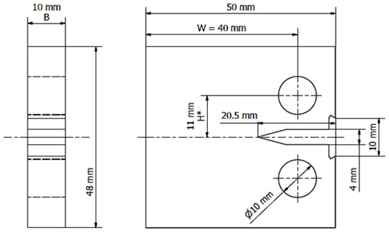 According to the research plan, the determination of the static properties was followed by determination of the mechanical characteristics to be used for a description of the Al–Ti layered material and the fracture toughness of its base materials. The fracture toughness for the linear-elastic range was determined using compact (CT) specimens with the dimension ratio W/B = 4 (Figure 5) for both ambient (293 K) and cryogenic (77 K) temperature. The application of specimens with the geometry resulting from the above-mentioned ratio was necessary as the target thickness of the sheet was about 10 mm. It was also indirectly determined by technological factors.