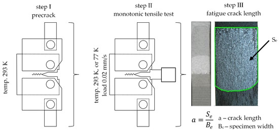 The second involving carrying out a monotonic tensile test of the CT specimen with the above-discussed fatigue crack. In the second stage of the tests the speed of the machine piston stroke was 0.02 mm·s−1. The process of tension was carried on until the loss of coherence between the stretched parts of the specimen. Since during the second stage of the experiment only the load and crack opening displacement were measured, it was possible to carry out the experiments under both ambient and cryogenic conditions. This was done for all three materials.