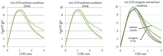 Diagrams of the curves for load-crack opening determined during tests of the maximal experimental value of the stress intensity factor for heat-treated AA2519 aluminum alloy obtained from the experimental tests are presented in Figure 7. The figure shows diagrams for both temperatures. The results of the tests provided on the basis of the diagrams are included in Table 3.