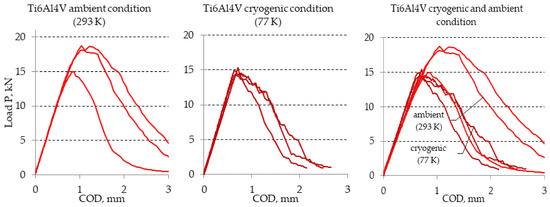 Diagrams of load-COD determined during tests of maximal experimental value of stress intensity factor KQ determined for titanium alloy Ti6Al4V under ambient and cryogenic conditions.