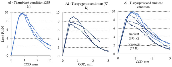 Diagrams of load–COD determined during the tests of the maximal experimental value of stress intensity factor KQ determined for the layered material AA2519–AA1050–Ti6Al4V under ambient and cryogenic conditions.