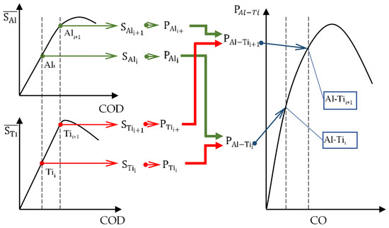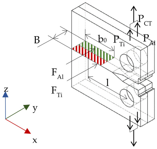 To enable comparison of the analytic results with the experimental ones, the averaged widths of layers and averaged lengths of cracks measured in real specimens were used for loads PAl and PTi (Figure 10). The quantities that were used for the calculations are presented in Table 6, and a scheme of the determination of the hypothetical load in the layered material, determined on the basis of the nominal stresses of the base materials, is presented in Figure 13.