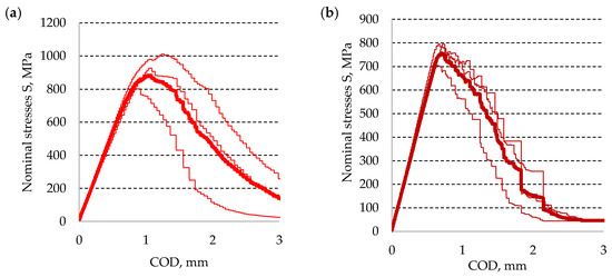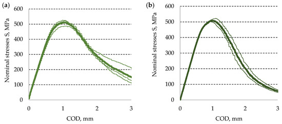 Using Dependence (8) and the experimental results for P, the diagram curves were determined for nominal stresses Smax as a function of the crack opening COD. The measured crack lengths were used for calculations of the considered nominal stresses. Averaged values of stress diagrams for both base materials are shown in Figure 11 for aluminum alloy and Figure 12 for titanium alloy, respectively. It needs to be noted that the thickest line is used for the diagram curve averaged value calculated from the remaining values.