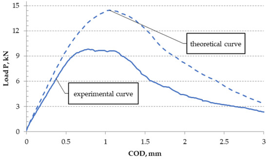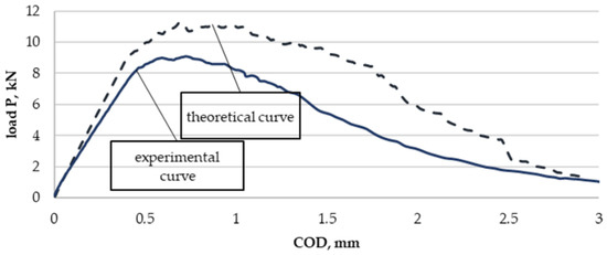 A comparison of the diagram of load-crack opening, obtained from calculations with a selected course obtained from the experiment, is shown in Figure 14.