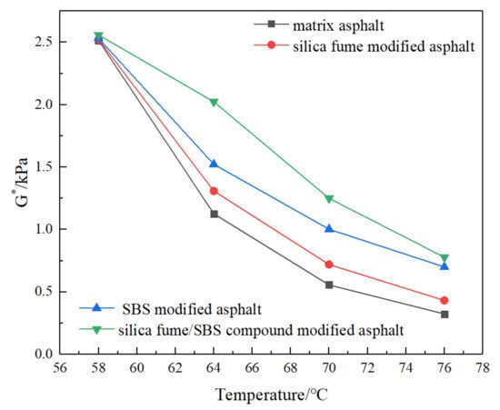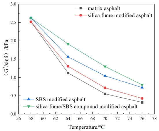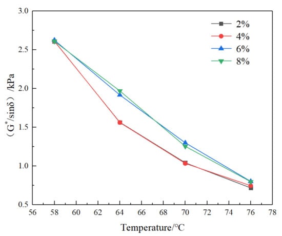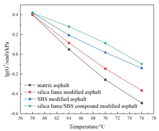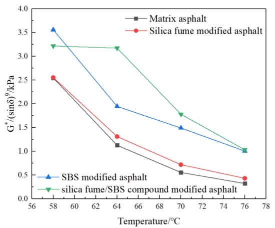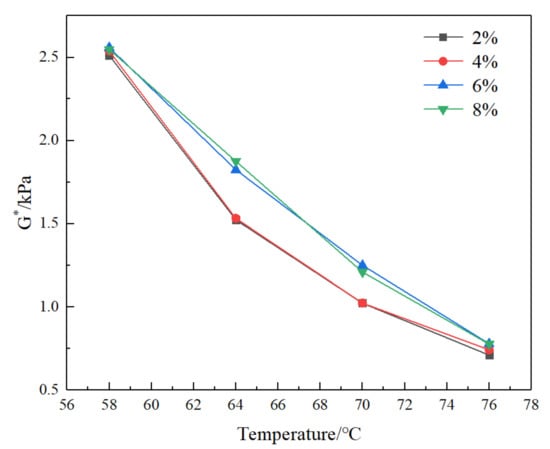 Regarding the Dynamic Shear Rheological (DSR) Test—in this article, a stress control pattern was employed. The stress level was held at 0.1 kPa, and the angular frequency was 10 rad/s. The diameters of the specimen were 25 mm (the thickness is 1 mm) and 8 mm (the thickness is 2 mm) (AASHTO T315-09); two parallel tests were carried out for each proportion of asphalt.