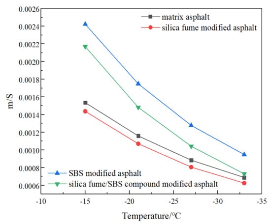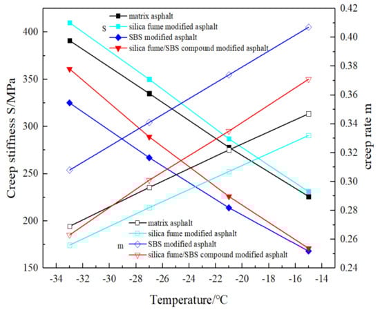 Regarding the Bending Beam Rheometer (BBR) Test—the creep stiffness modulus S and creep rate m can be acquired through BBR trail, and afterwards the microtherm properties of bitumen can be analyzed by these two parameters. The size of the test piece is length × width × thickness (102 × 12.7 × 6.35 mm) (AASHTO T313-09); two parallel tests were carried out for each proportion of asphalt.