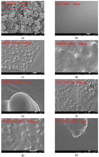 In the experiment, JRJ-300-I (Shanghai Specimen Model Factory, Shanghai, China) type high speed shear agitation emulsifier was used to prepare SFSCMA. The MA was heated to the melting state, then it was sheared with SBS and dried SF at 170–190 °C at high speed, with a rotating speed of 5000 r/min and a shearing time of 60 min. After shearing, it was stirred evenly for 30 min to prepare SFSCMA. The penetration test, ductility test, softening point test, DSR test, and BBR test were carried out for MA, SBSMA, SFMA, and SFSCMA.