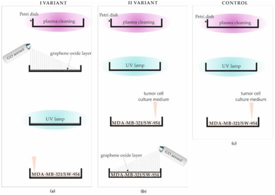 - The reference samples (control) were made similar to variant II for both cell lines, but without the final stage of the GO deposition. The Petri dish was plasma cleaned, subjected to UV radiation for sterilization, and then, the cell culture procedure was performed as it was described in Section 2.3.
