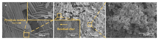 3.4. Ablation Mechanism of the Surface-Decorated ZrB2–SiC-Modified C–Ph Composite