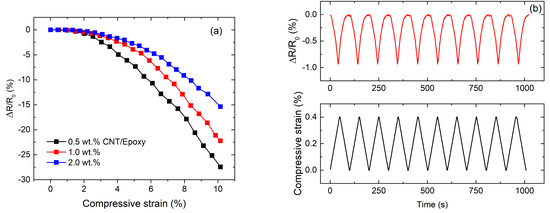 The electro-mechanical response of CNT/epoxy composites was investigated under both static and cyclic compressive loadings. Figure 4a showed the change in resistance of CNT/epoxy composites under the static compressive loadings at room temperature. It can be clearly seen that the resistance of all specimens decreased with increasing compressive loading with nonlinear behavior. Additionally, the piezo-resistive behavior of CNT/epoxy composites is similar to that observed by Yin et al. [24], which significantly depends on CNT concentration. A higher CNT content lead to a smaller resistance change during the compressive loadings. This could be due to the fact that increasing CNTs concentration reduces the inter-particle distance between adjacent CNTs, thus allowing the potential for greater possible contact between them under that compressive loading. Figure 4b,c showed the change in resistance of the CNT/epoxy composites under cyclic compressive loadings within elastic region at the room temperature. The resistance changes for the specimen showed excellent correspondence with the changes in the applied compressive strain. It was also observed that CNT/epoxy composite with higher CNT concentration provides lower strain sensitivity under the cyclic compressive loadings.