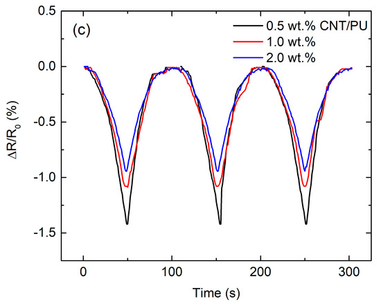 Temperature generally affects the materials properties of CNT reinforced composite [25,26,27]. Figure 5 showed the influence of temperature on the change in resistance of CNT/epoxy composites at rest. All CNT/epoxy composites presented a positive temperature coefficient, where the resistance of all samples increased at elevated temperature. The positive temperature coefficient for CNT/epoxy composites can be explained by the rearrangement of CNT network brought about by the volumetric expansion of epoxy matrix as the temperature rises. It can be noted that the change, with temperature, in the normalized resistance for the sample with the highest CNT concentration is smaller than for the low CNT. This behavior can be associated with the better stability of CNT network structure, associated with the higher CNTs concentrations, facilitating better electron transfer through the inter-particle channels [28].