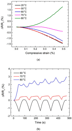 Although there has been much research on the effect of temperature on electrical properties of carbon nanotube reinforced composites at rest, there has been no research on the electro-mechanical behavior of those materials under the different temperatures. Therefore, we studied the electro-mechanical behavior of CNT/epoxy composite with 65 °C of the glass transition temperature [29] under static as well as cyclic compressive loadings. Figure 6a showed the change in resistance of 1.0 wt % CNT/epoxy composites under the static compressive loading at various temperatures. It was observed that the resistance behavior of samples varies with applied temperature. The specimens exposed to 20–60 °C showed the similar electro-mechanical behavior during the static compressive loading, whereas the specimen with 70 °C showed significant reduction in resistance compared to those with 20–60 °C and the specimen with 80 °C showed the increase in resistance which is an opposite trend with the samples with 20–60 °C. Figure 6b showed the electro-mechanical behavior of CNT/epoxy composites under the cyclic compressive loadings. For specimens tested between 20–60 °C, the resistance change observed remained remarkably consistent in nature during the cyclic compressive loadings. However, above this temperature range, those tested in 70 and 80 °C exhibited a different resistance response with poor repeatability, which is not applicable for repeatable sensing application. Considering their glass transition temperature (Tg) of 65 °C, Tg significantly affects the electro-mechanical response of CNT/epoxy composites. It can be speculated, shown in the Figure 7, that the irreversible volumetric change of CNT/epoxy composite due to Tg would increase in the inter-distance between CNTs and thus regenerate CNT network, destroying conductive pathways and thus increasing resistance under the compressive loadings.