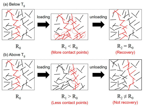 Schematic illustration of microstructure of CNT/epoxy composite (a) below the glass transition temperature and (b) above the glass transition temperature.
