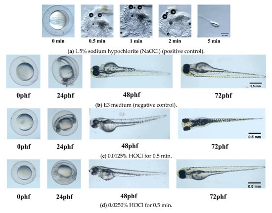 The mortality of Zebrafish embryos exposed to different concentrations of HOCl and NaOCl was determined at specific time points. Figure 1 shows photomicrographs of zebrafish embryo under conditions of positive control (1.5% NaOCl) and negative control (E3 medium), in 0.0125% HOCl for 0.5 min and in 0.0250% HOCl for 0.5 min, respectively. Zebrafish embryo was almost fully dissolved in 1.5% NaOCl within 5 min; while zebrafish embryos hatched and grew healthily in E3 medium up to 72 phf.