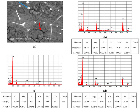 Figure 4 presents the EDS spectra registered in some points highlighted in the SEM micrograph of the coated ZMX410 sample (Figure 4a). EDS spectra contained data that refer to globular particles presented in Figure 4b (blue arrow in the Figure 4a), surface (Figure 4c; white arrow in the Figure 4a) and compounds at the grain boundary (Figure 4d; red arrow in the Figure 4a).