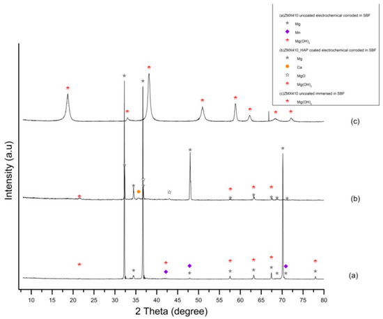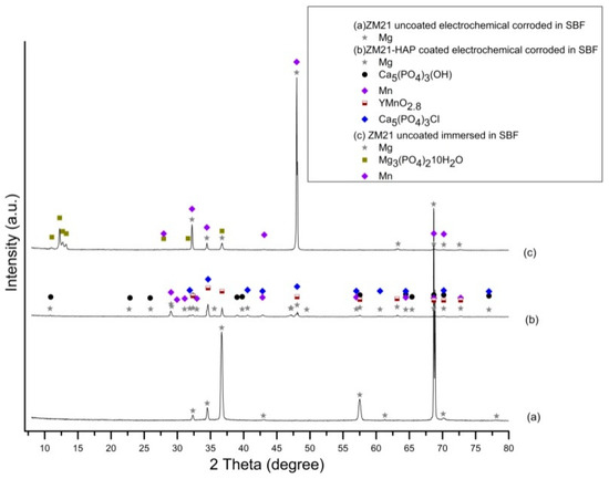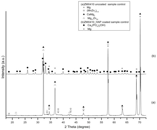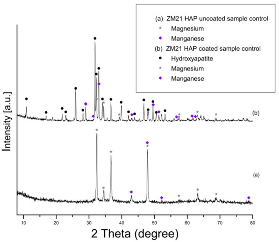 Prior to performing the corrosion experiments on the uncoated and HAP coated ZM21 and ZMX410 samples, they were subjected to the XRD analysis. According to the XRD diffractograms, the coating layers are composed of pure HAP. Indeed, a diffraction peak at about 2θ = 33°, corresponding to the semi-crystalline HAP (according to the ICDD9-432), was registered. The other constituent phases of the ZM21 and ZMX410 alloys were not present in the XRD patterns because their amounts in the bulk material were below the detection limit of the instrument. In particular, the XRD diffractograms of the uncoated and HA coated ZM21 alloys, presented in Figure 5a,b, exhibit two main peaks at 2θ = 32.37° and 2θ = 47.86°, corresponding to Mg, and at 2θ = 47.79°, corresponding to Mn. Diffractogram (b) also highlights the main at 2θ = 33° along with broad peaks at 2θ = 25.95°, 2θ = 31.82°, 2θ = 32.37°, 2θ = 34.11°, indicating the presence of HAP on the ZM21 surface. Other peaks at 2θ = 32.36° and 2θ = 34.48° were attributed to Mg, and at 2θ = 31.27° and 2θ = 33° to Mn.
