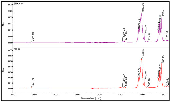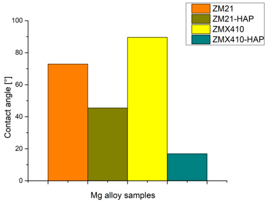 The application of the ZM21 and ZMX410 alloys in the medical field requires the improvement of surface properties to ensure their biocompatibility and good interactions at the biological environment–implant interface. Increased wettability properties contribute to optimizing the response of implant material to physiological condition [65]. The hydrophilic/hydrophobic character is influenced by material composition and treatment, and also by homogeneity of the surface [66]. Material composition and surface roughness have an important influence on the contact angle and wettability of a surface. The smaller values of contact angles (CA) obtained during in the analysis and water behavior in contact with the uncoated and coated ZM21 and ZMX410 alloys reflect the surface properties of hydrophilic character, good adherence, and thin film formation ability.