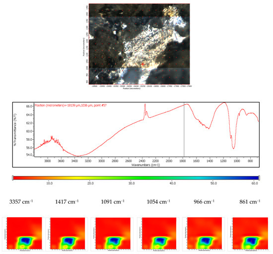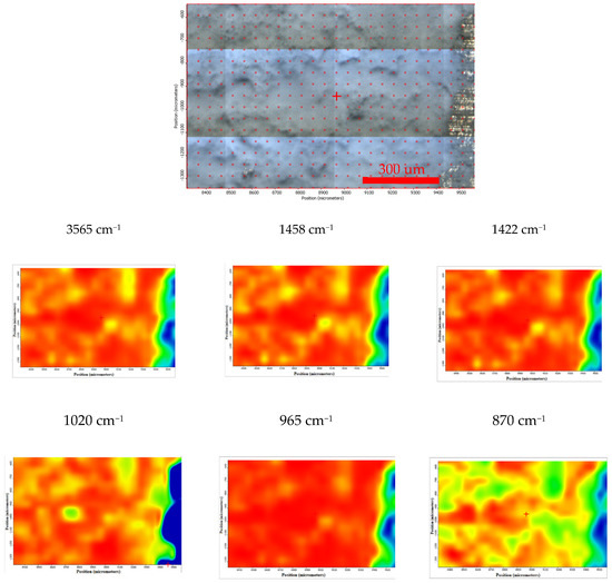 FTIR diagram and chemigram maps of the coated ZMX 410 alloy exposed to SBF. In the upper part, a dark field optical image, corresponding to the investigated area, is presented. In the lower part, false colour maps with the indicated reference bands are shown. The chemigram scale bars are expressed in μm.