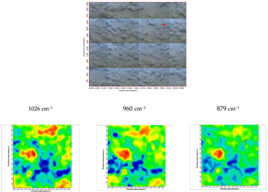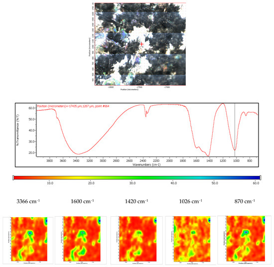 The coated ZM 21 sample was also exposed to the SBF, in order to evaluate its in vitro behavior. According to the obtained spectra, it can be concluded that these coated samples are bioactive and carbonated during the immersion. The surface change is heterogeneous, as it was demonstrated by the FTIR microscopy in both the video and IR imaging mode (Figure 19). In the video mode, light and dark areas indicate heterogeneities, while in the imaging mode, according to the maps recorded with the 1026 cm−1 reference band (specific to HAP) and with 1420 cm−1 (specific to carbonate) important heterogeneities can be observed, these areas being of up to 100 µm2. It is also important to mention that carbonatation leads to an increase in the hydrophilicity of the surface, as the maps recorded at a characteristic wavelength of free water (3366 cm−1) were very similar to that of carbonate (1420 cm−1).