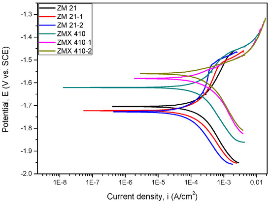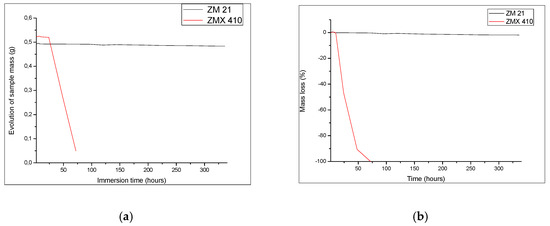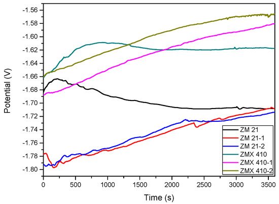 The corrosion resistance assessment of ZM21 and ZMX410 alloys was performed in SBF, Kokubo solution. The SBF was prepared in the laboratory, according to the protocol proposed by Kokubo [51]. The experiments of biodegradation were conducted by a simple immersion test and by electrochemical method.