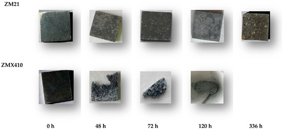 The experiment consisted in immersion of the ZM21 and ZMX410 samples in the polyethylene dishes with 50 cm3 of SBF and sinking the dishes into a thermostatic bath type Thermo-circulator from LabTech (Italy), in which water is maintained at a temperature of 37 °C similar to the human body. The corrosion behaviour of the samples was observed by examining the surface modifications and by weighing them after removing from SBF and subsequent drying. The ZM21 and ZMX410 samples were weighed with the balance type WLC 2/A2 produced by RADWAG Balances and Scales, at the beginning and daily at the same hour, for 14 days.
