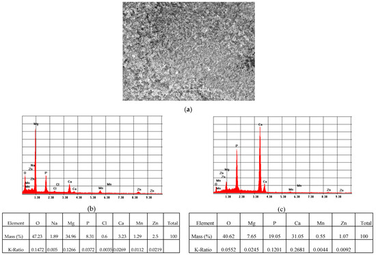 Elemental composition of the ZM21 and ZMX410 samples coated with HAP was determined by the EDS method. Figure 3a presents the morphology of the coated ZM21 surface and Figure 3b exhibits its elemental composition, characterized by the presence of the main elements of the alloy and HAP.