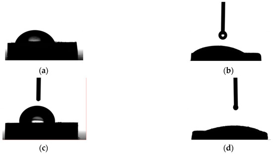 Photograph of water contact with Mg alloy surfaces: (a) ZM21; (b) ZM21-HAP; (c) ZMX410; (d) ZMX410-HAP.
