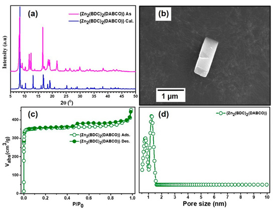 (a) PXRD patterns of as-synthesized Zn-MOF, (b) SEM image of Zn-MOF (c) N2 sorption analysis and (d) NLDFT pore size distribution profile.