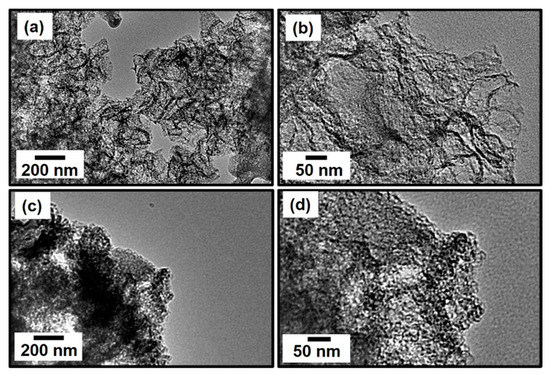 TEM images of (a) NPC800 at the 200 nm scale, (b) NPC800 at the 50 nm scale, (c) NPC900 at the 200 nm scale and (d) NPC900 at the 50 nm scale.