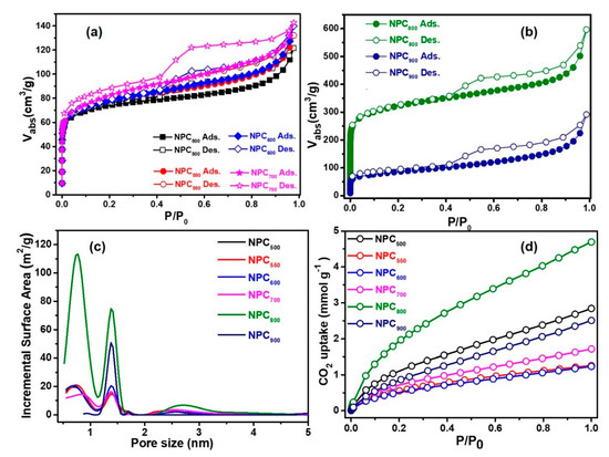 The textural properties of these NPC materials were evaluated by the N2 sorption analyzer. The Figure 4a–c represented the N2 uptake isotherm and corresponding pore sizes of the NPC materials. Table 1 represents the NPC material’s surface area, pore volume and pore size. The N2 sorption curves of the NPC materials possess type-I isotherms that steeply climb in the low-pressure range (P/P0 = 0−0.10), suggesting that micropores were dominant [45]. In the high-pressure range (P/P0 = 0.40−1.00), there were decent increases in the adsorption in all samples and a slight hysteresis loop between the sorption curves, which revealed that mesopores were also present in the materials. The surface area and total pore volume of the NPC500–700 materials is nearly equal to 273, 287, 289, 296 m2/g and 0.18, 0.20, 0.22, 0.22 cm3/g correspondingly (see Table 1).