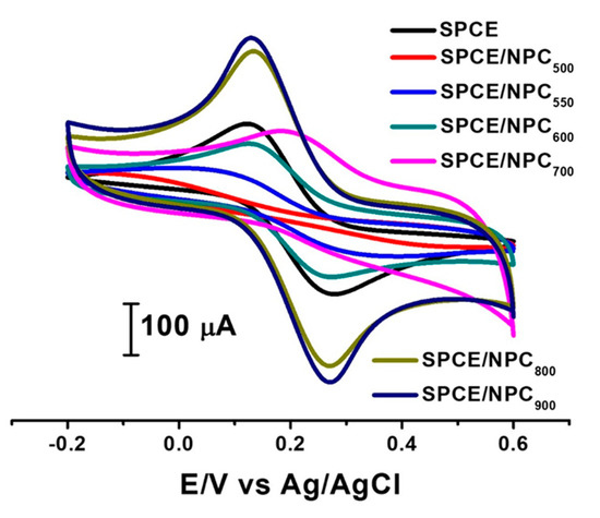 CV analysis was executed to study the electrochemical behavior of SPCE and SPCE/NPCT modified electrodes in 5 mM FeCN under a potential window from –0.2 to +0.6 V. As can be seen in Figure 5, bare SPCE exhibit a well-defined reversible redox peak at E° = +193 mV with a peak to peak potential difference (ΔEp = Epa − Epc) value of 126 mV, which is the characteristic peak for Fe2+/Fe3+ interconversion [46,47]. After SPCE/NPCT modification, relatively higher/lower redox current responses were noticed with a ΔEp value of about 561, 235, 125, 112, 137 and 140 mV, while the relative current change (ΔIa) was recorded for SPCE/NPC500, SPCE/NPC550, SPCE/NPC600, SPCE/NPC700, SPCE/NPC800, SPCE/NPC900 of about −99, −88, −29, −12, +83 and +113 µA, respectively. The observation is due to the semiconductor Zn moieties existing up to a carbonization temperature of 700 °C that results in a decrease in FeCN signal. In contrary, carbonization at 800 and 900 °C produced relatively smaller Zn moieties with NPC and hence an increase in signal. This result suggests that the semiconductor Zn content decreased with increasing carbonization temperature. In other words, the FeCN current response is inversely proportional to the Zn content. The obtained results coincide with the elemental analysis, ICP-MS and PXRD results.