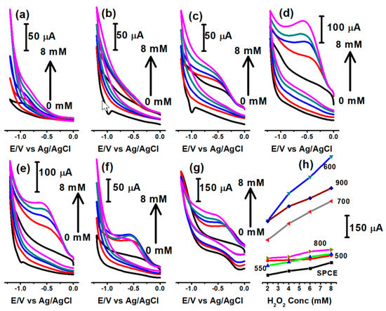 Cyclic voltammetric detection of H2O2 in 0.1 M, pH 7PB (a) SPCE, (b) SPCE/NPC500, (c), SPCE/NPC550, (d) SPCE/NPC600, (e) SPCE/NPC700, (f) SPCE/NPC800 and (g) SPCE/NPC900, respectively. (h) Their corresponding current verses concentration plots.
