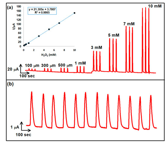 (a) Detection of H2O2 by FIA method at SPCE/NPC600, (b) FIA responses of 12 continuous injections of 0.5 mM H2O2.
