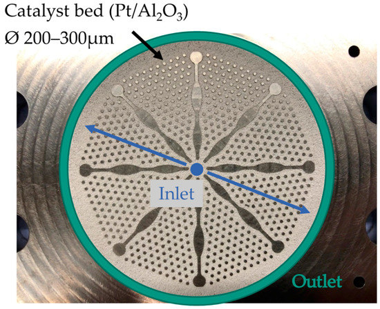 A microstructured radial flow reactor was used (see Figure 3). The microstructure consists of several circular sectors that are separated by fins and hexagonal distributed pins whose gaps are filled with catalyst. The LOHC enters in the middle and flows radially outwards, where the product mixture is collected in a circular ring channel below a circular metal filter, before leaving the reactor. A detailed description of the apparatus can be found in [18]. The catalyst used was provided by Clariant (Heufeld, Germany) and has a core-shell configuration. The carrier is porous Al2O3, while the shell consists of the active component platinum. The catalyst was tuned with sulfur due to improved activity and reduced side product formation [19]. For the experiments, the microstructure was filled with particles of the fraction of 200–300 µm without dilution; thereby a total catalyst mass of 1.51 g was integrated. The Pt loading is 0.3 mass%.