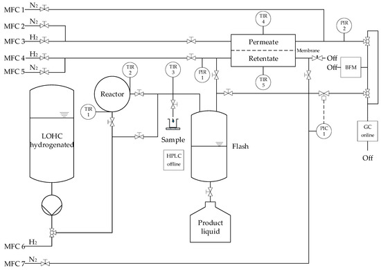 Figure 5 shows a simplified process flow diagram of the test rig. The LOHC is pumped via a micro annular gear pump (MZR-2905, HNP Mikrosysteme GmbH, Schwerin, Germany) from the tank into the system. The liquid is heated and then fed into the reactor. Closely before and after the catalyst bed, the temperature is measured (TIR 1, TIR 2) and averaged for further calculations, although negligible temperature differences have been observed (less than 2 °C). The product flow is cooled down to ambient temperature (25 °C, TIR 3 is used for control) up to the sampling point, where liquid is collected and analyzed via high performance liquid chromatography (HPLC) with a refractometer as detector. The gas and liquid phases are separated from each other in a tank as phase separator. The product gas can either be directed to the membrane or directly to the gas chromatograph (GC) or bubble meter for analysis. The membrane separates the product into retentate and permeate, which can be measured separately or in mixed state in the GC or bubble column. The bubble meter serves as a control of the calculated fluxes in the GC. The reactor and membrane separator are electrically heated separately via heating cartridges. The temperature of the membrane was measured outside, directly at the membrane module, both on the retentate and permeate side (TIR 4, TIR 5), and averaged (less than 1 °C difference). The gas supply during start-up and shut-down phase—as well as for the reduction of the catalyst or pure gas experiments with the membrane—is provided by mass flow controllers (MFC 2-6). MFC 1 and MFC 7 were used to add nitrogen as internal standard (ISTD) for GC analysis. N2 from MFC 7 was used to provide stable pressure by a pressure retention valve (Flowserve GmbH, Essen, Germany), because the membrane area could be so large that most hydrogen will be permeated, depending on the operating conditions. N2 by MFC 7 was also required for initial pressure build-up.