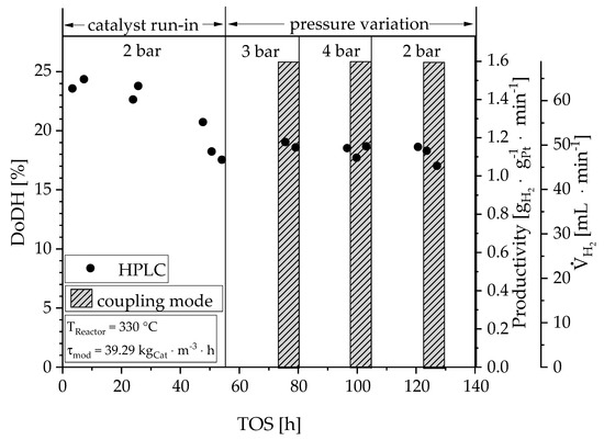 For the coupling of the membrane with the reactor, the membrane characterized in the previous section was replaced by a fresh one from the same batch. Figure 9 shows the degree of dehydrogenation (DoDH), as well as the calculated parameters: catalyst-related productivity and standard volume flow as a function of the time on stream. The vertical lines mark the pressure in the corresponding time period. The shaded areas indicate the time intervals in which the product gas was fed to the membrane separation system (coupled state). After an initial two days, a stationary state was reached—during this time the degree of dehydration dropped from 24% to 18 %. In the course of the following pressure variation, the degree of dehydrogenation remained constant. A high productivity of 1.15 gH2∙gPt−1∙min−1 was achieved. Out of 23 g∙h−1 LOHC approx. 3 NL∙h−1 were released. Both the HPLC and GC measurements (for the sake of clarity not mentioned further) confirm these findings. Regardless of the fact that the hydrogen partial pressure has a positive influence on the stability of the catalyst, it was expected that the degree of dehydrogenation decreases with increasing pressure due to thermodynamics (confirmed in other experiments [27,28]). Thus, this observation might be explained by limitation, by reaction kinetics, or by a pressure-dependent residence time change in the reactor. The hydrogen bubbles from the reaction change their volume depending on the pressure. The larger the bubbles (the lower the pressure), the more the liquid is pushed out of the small reaction chamber. As a result, the actual residence time levels out a higher intrinsic reaction rate at lower pressure.
