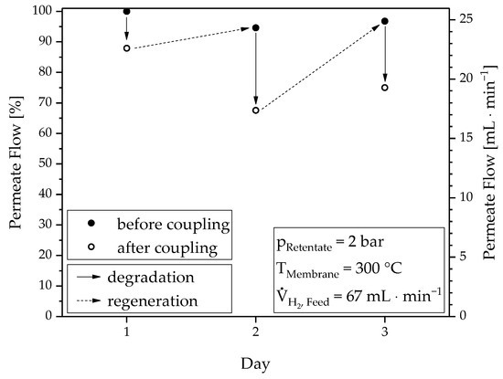 Degradation and regeneration behavior of the membrane: Hydrogen flow before and after each coupling experiment at constant conditions (2 bar, 300 °C and 67 NmL∙min−1).