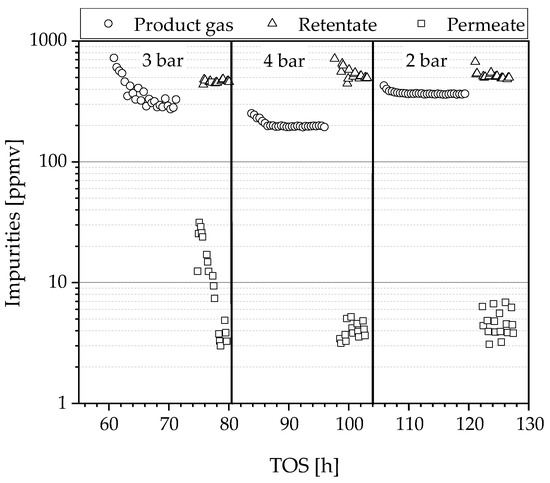 The impurities in the product gas, retentate and permeate were determined by gas chromatography, as described in Chapter 2.5, and plotted over the time on stream in Figure 11. In the product gas, impurities vary between 200–400 ppmv and decrease with higher reaction pressure. An explanation is that these impurities are condensed in higher percentages as the total pressure was increased. Another possible explanation from a reaction point of view is the higher hydrogen partial pressure, which causes more hydrogen to adsorb on the catalyst causing inhibition of by-product formation. Contrary to the literature, no CO could be detected [8,9]. Possible explanations are the increasing methanation activity (formation of methane via hydrogenation of CO) with increasing pressure and/or the poor detection limit of the GC for CO. Independent of the pressure applied, the impurities in the hydrogen could be reduced to 3–7 ppmv, which corresponds to a quality of 5.0 (>99.999%). Between 74–78 h a concentration higher than 10 ppmv was measured in the permeate at 3 bar, which can be explained by residual contamination of the GC sampling loop. The same GC was used for the analysis of both streams, permeate and retentate; an indication is the ubiquitous trend to lower values over time on stream. To minimize this problem, the flushing time between the measurements was increased between the measurements of 3 bar and 4 bar. However, it could not be guaranteed that all residues were removed. Since only aromatic compounds were detected in the permeate, it can be assumed that these are mainly contaminants of the sample loop and that the purity is actually higher than measured.