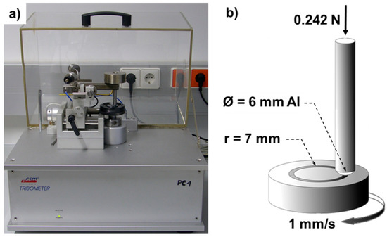 The sliding wear behavior against aluminum was investigated using a ball-on-disk test (CSM Instruments SA, Peuseux, Switzerland, Figure 1a) [16,41,42], where aluminum balls (Al 99.5) of 6 mm in diameter loaded with 0.242 N normal force were rubbed over the functionalized Cu–O coated steel disks with a sliding speed of 1 mm/s for 5 m on a 14 mm wide circular track (Figure 1b) to resemble the contact pressure in Al cold forging [22,43,44]. As great challenges in liquid lubricant-free Al-forming processes are Al-sticking and adhesion [15,19,21], ball-on-disk tests were carried out for 5 m of sliding distances to appraise the influence of molecular coverage on the tribological behavior. Each molecular coverage was tested once using a separately functionalized disk of 22 mm diameter. During ball-on-disk tests, temperature and humidity in the laboratory were kept constant at 297 K and relative humidity of 45%, respectively. Surfaces of all samples were examined after sliding tests by scanning electron microscopy (SEM) and energy dispersive X-ray analysis (EDX) with a Hitachi TM4000Plus (Hitachi, Tokyo, Japan) equipped with a backscattered electron (BSE) detector for imaging and a Bruker Quantax 75 EDX-detector (Bruker, Billerica, MA, USA). Elemental EDX-mappings with 100 measurement cycles containing 1200 × 900 pixels were quantitatively analyzed applying the QMap-toolbox of the Esprit 2.1 software (Bruker, Billerica, MA, USA) with an 8 × 8 binning. Wear track widths were determined at six equidistant and equally distributed positions utilizing a VK-9710K laser optical microscope (Keyence, Osaka, Japan) after carefully inspecting the complete wear track. Representative positions for SEM-pictures were chosen in agreement with the determined wear track width. Mass changes compared to the samples prior to ball-on-disk experiments were measured using an ABJ 80-4M electronic balance (Kern, Balingen, Germany).