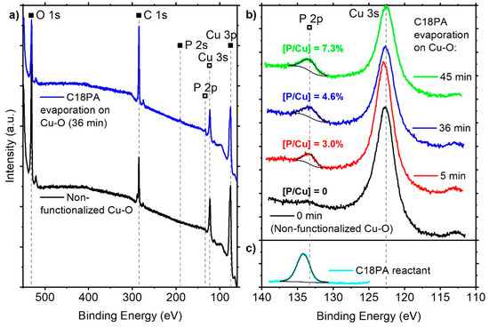 X-ray photoelectron spectra were collected from all relevant surfaces as well as from powder of the C18PA reactant carefully pressed into soft indium foil. The overview spectra in Figure 2a reveal only signals stemming either from the Cu–O surface or the C18PA molecules. All surfaces with C18PA evaporation exhibit P 2p signals positioned at 133.2–133.3 eV (Figure 2b). Their full width at half-maximum (FWHM) is found at 1.8 and 2.3 eV for the 5 and 36–45 min evaporation, respectively. The P 2p signal of the C18PA reactant is located at 134.2 eV with an FWHM of 2.1 eV (Figure 2c). Evidentially, the 0.9–1.0 eV chemical shift of P 2p signals from C18PA-molecules on Cu–O surfaces compared to the non-evaporated molecules resembles the formation of P–O–M bonds as previously observed for other metal oxide surfaces [22,45,46,47]. Thus, C18PA molecules evaporated on Cu–O surfaces are chemisorbed by P–O–Cu bonds forming a monolayer with distal n-octadecyl residues.