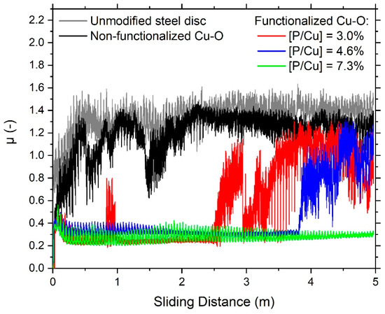 Friction coefficient µ measured for aluminum sliding over Cu–O coated steel surfaces without and with C18PA functionalization of different molecular coverages and over an unmodified steel disk. Coverages are indicated by P/Cu-ratios.