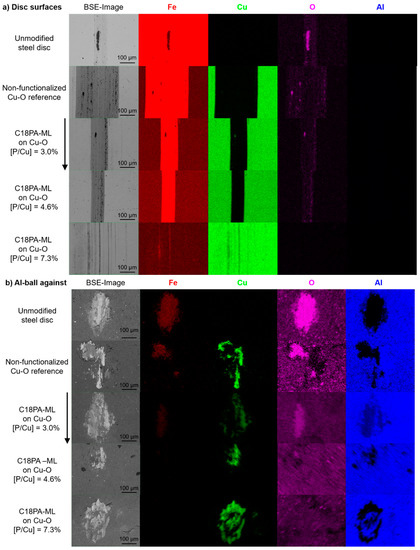Elemental distribution of Cu–O surfaces coated on tool steel disks without and with C18PA functionalization of different molecular coverages and of an unmodified disk (a) as well as of corresponding aluminum counter-bodies (b) obtained by X-ray analysis (EDX) after ball-on-disk experiments. Coverages are indicated by the P/Cu-ratio, the sliding direction by an arrow.