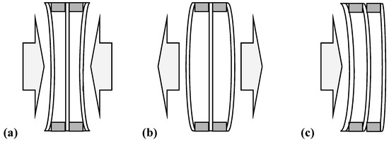 Tight gaps, however, determine some specific properties of IGUs in the context of environmental loads transfer and the associated deformation of structural elements. The gap is filled with gas in the production process of the unit, therefore the gas in the gap has some initial parameters of pressure, temperature, and volume. Under operating conditions, an insulating glass unit is exposed to climatic loads which generate loads and deflections of the component glass panes due to the pressure difference between the gap and the environment. For example, an increase in atmospheric pressure or a decrease in the gas temperature in the gap results in a concave form of deflection of the panes (Figure 1a) and the opposite changes of these parameters in a convex form (Figure 1b). The magnitude of the under or overpressure in the gap depends not only on the value of climatic loads, but also on the structure of IGU. In general, it increases with reduced IGU dimensions (width × length), increased thickness of the gas gap, and increased thickness of the component glass plates. How the pressure difference affects the deflections in IGU will be presented later in this article.