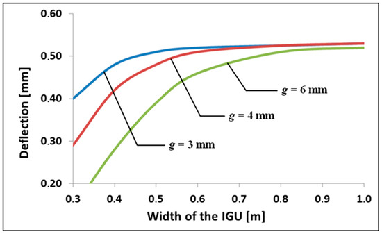 On the basis of the calculations presented in Table 2, it was found that the calculated values of sc and sm for analyzed IGUs with gaps of the same nominal thickness do not differ much from each other. This is despite the fact that the deflection of component glass panes varies considerably. The effect of gas interactions in tight gaps can be seen here. Rigid panes are less susceptible to deflection, but the external load is less compensated for by the gas pressure in the gap. After changing the thickness of all the panes in a unit, the load changes, but the deflections are similar. Therefore, when one of the glass panes changes to a stiffer one, the absolute load values of component glass panes increase, although their algebraic sum for each IGU is equal to 0. After such conversion, the less rigid panes deflect more because they are exposed to a higher loading—for this reason, a loaded IGU has approximately constant volume of gaps, despite the change in thickness of the component panes.